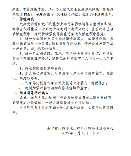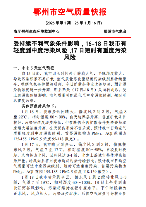 鄂州市空气质量快报(2026年第1期26年1月16日)