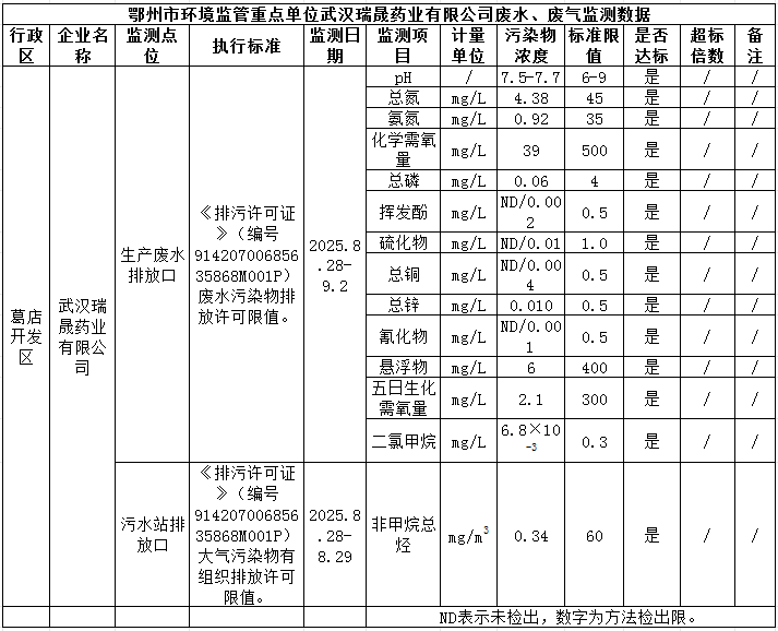 鄂州市环境监管重点单位武汉瑞晟药业有限公司废水、废气监测数据