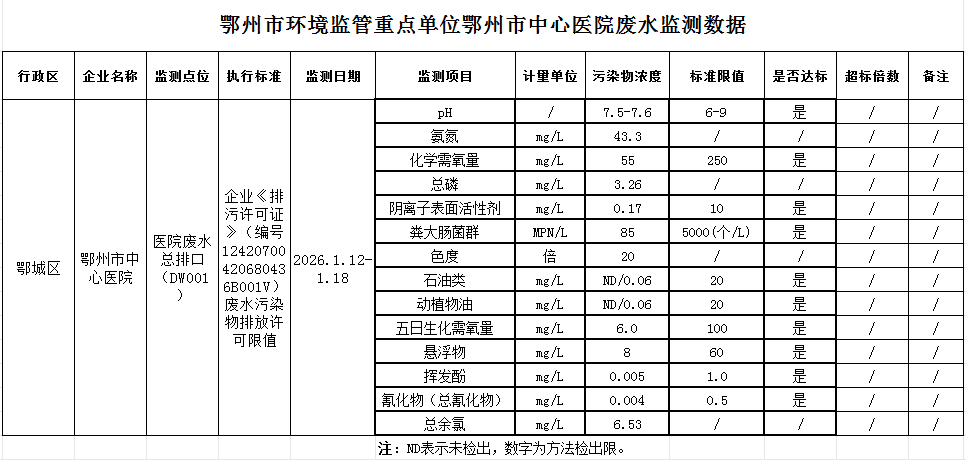 鄂州市环境监管重点单位鄂州市中心医院废水监测数据