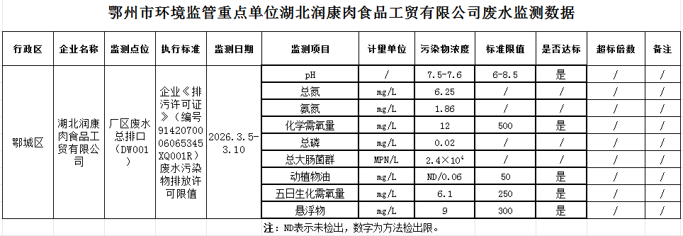 鄂州市环境监管重点单位湖北润康肉食品工贸有限公司废水监测数据