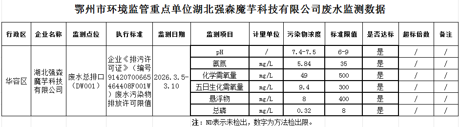 鄂州市环境监管重点单位湖北强森魔芋科技有限公司废水监测数据