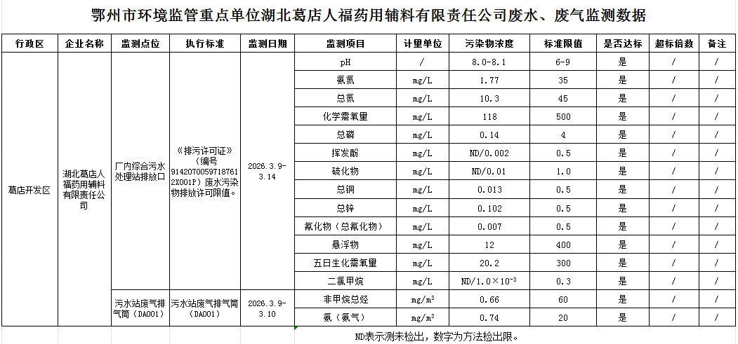 鄂州市环境监管重点单位湖北葛店人福药用辅料有限责任公司废水、废气监测数据