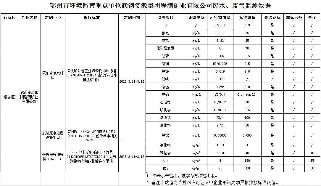 鄂州市环境监管重点单位武钢资源集团程潮矿业有限公司废水、废气监测数据