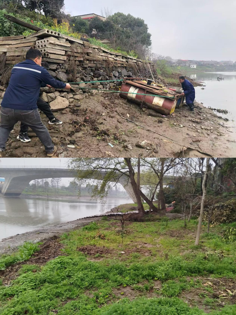 三是村社“立足实际”靶向整治。长港河沿线各村社区聚焦治理难点、痛点,精准施策、靶向发力。杜山村靶向整治河坡种植、家禽散养两大顽疾,迅速部署、主动作为,通过入户引导、现场整治,从源头上掐断农业面源污染通道,让河坡回归自然本貌。旭光村聚焦沿河“钓鱼台”乱象,开展“清台还岸”专项行动,主动出击,逐一对违规钓鱼台进行排查清理,组织人员拆除搭建物、平整岸坡,清理沿岸垃圾,消除安全隐患,也还原河岸的整洁有序。月河村直面岸线“清菜园”难题,组织机械与人力协同作战,对沿岸违规种菜区域进行全面清理,及时制止违规行为、督促整改落实,用实际行动彰显河道治理的坚定决心,守护河岸生态安全。范墩村同步整治“菜园乱象”与“钓鱼台违建”,组织专人开展地毯式排查,明确分工、协同发力,对违规种植的菜园进行清理、对私自搭建的钓鱼台进行拆除,全面清理沿岸垃圾杂物,经过集中整治,长港河沿线岸线重新恢复清爽整洁,生态风貌得到显著提升。