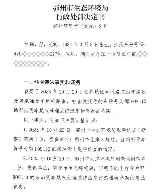 你的柴油货车(鄂H08L10)尾气处理系统温度传感器被垫高,该行为违反了《中华人民共和国大气污染防治法》第五十五条第三款的规定,依据《中华人民共和国大气污染防治法》第一百一十二条第三款的规定,我局决定对你罚款伍仟元整。